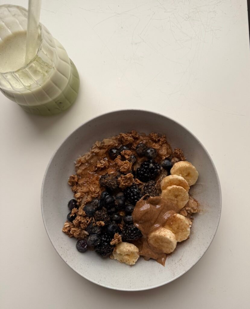 This cozy almond butter blueberry oatmeal bowl is the perfect balance of comfort and nourishment. Made with hearty oats, creamy almond butter, fiber-rich chia seeds, naturally sweet banana, juicy blueberries, and warm cinnamon, this bowl is packed with long-lasting energy and nutrients to keep you full for hours.